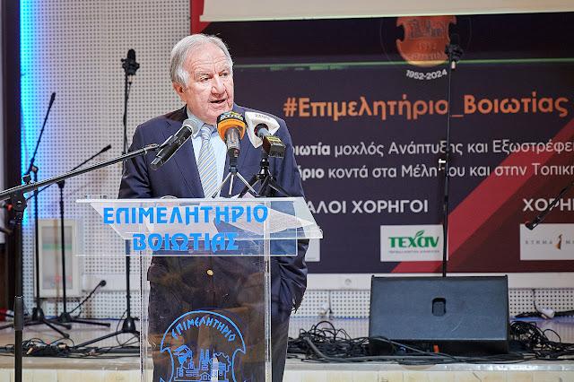 Με την παρουσία του Κυβερνητικού Εκπροσώπου και Υφυπουργού στον Πρωθυπουργό, κ. Παύλου Μαρινάκη, την συμμετοχή αντιπροσωπειών από την επιμελητηριακή κοινότητα της χώρας, εκπροσώπων της πολιτικής ζωής του τόπου, εκπροσώπων του α` και του β` βαθμού Αυτοδιοίκησης, της Εκκλησίας και των παραγωγικών, κοινωνικών και πολιτιστικών φορέων της τοπικής κοινωνίας, πραγματοποιήθηκε, με μεγάλη επιτυχία, η εορταστική εκδήλωση του Επιμελητηρίου Βοιωτίας, την Τετάρτη, 7 Φεβρουαρίου 2024, στο «Ρόδον Palace», στέλνοντας το μήνυμα: «Η Βοιωτία μοχλός ανάπτυξης και εξωστρέφειας, το Επιμελητήριο Βοιωτίας δίπλα στα μέλη του και στην τοπική κοινωνία» .