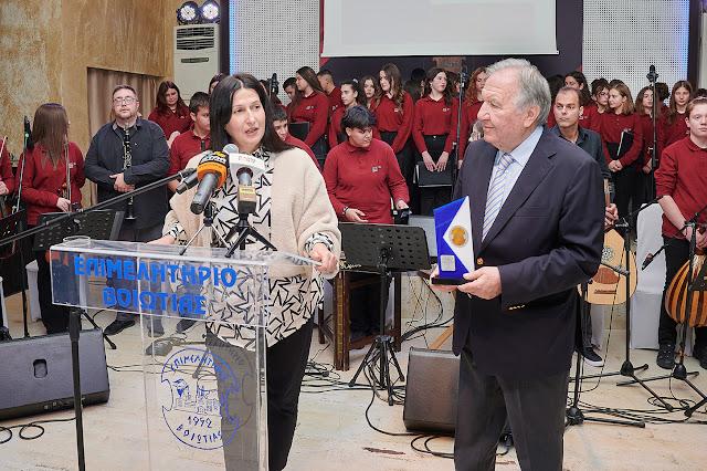 Στο πλαίσιο αυτό, η εορταστική εκδήλωση για το καλωσόρισμα του 2024 ξεκίνησε με το Μουσικό Σχολείο Λιβαδειάς και ένα πλούσιο πρόγραμμα παραδοσιακής μουσικής, που είχαν ετοιμάσει εκπαιδευτικοί και μαθητές, Με το πέρας του μουσικού προγράμματος, ο Πρόεδρος κ. Παναγιώτης Αγνιάδης βράβευσε συμβολικά την Διευθύντρια του, κα Παρασκευή Μητρατζούλη«για την πολύτιμη συνεισφορά του σχολείου, στην εκπαίδευση και στον πολιτισμό όλης της Βοιωτίας».