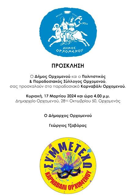 Ο Δήμος Ορχομενού με την συνδιοργάνωση του Πολιτιστικού και Παραδοσιακού Συλλόγου Ορχομενού και την καθοριστική συμβολή της Περιφέρειας Στερεάς Ελλάδας – ΟΠΑΣΤΕ, μας προσκαλούν σε ένα τριήμερο εκδηλώσεων σε αποκριάτικους ρυθμούς, διασκέδαση και δωρεάν εδέσματα στα παραδοσιακά Κούλουμα.