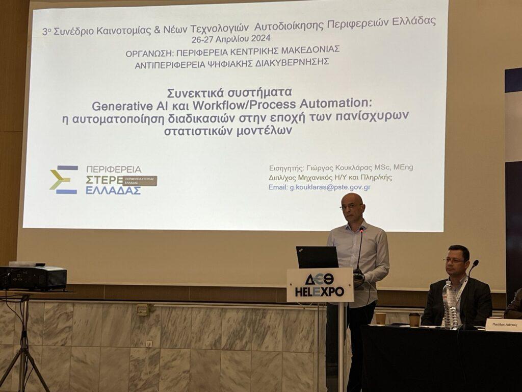 Τέλος, η Περιφέρεια Στερεάς Ελλάδας συμμετείχε στο 3ο συνέδριο Καινοτομίας και Νέων Τεχνολογιών Τοπικής Αυτοδιοίκησης με θέμα την τεχνητή νοημοσύνη που πραγματοποιήθηκε στη Θεσσαλονίκη την 26η ως την 27η στο πλαίσιο της BEYOND.Κατά τη διάρκεια του συνεδρίου συμμετείχε η διεύθυνση πληροφορικής Περιφέρειας Στερεάς Ελλάδας, κάνοντας εισήγηση με τίτλο «Συνεκτικά συστήματα Τεχνητής Νοημοσύνης και Work/Process Automation: η αυτοματοποίηση διαδικασιών στην εποχή των πανίσχυρων στατιστικών μοντέλων».