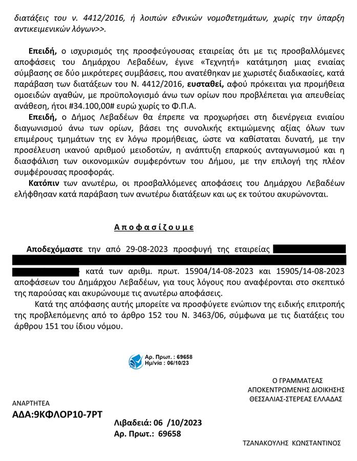 • Ακύρωση 2 αποφάσεών σας από την Αποκεντρωμένη Διοίκηση, για απευθείας ανάθεση που κάνατε, με το σκεπτικό ότι δεν διασφαλίστηκαν τα οικονομικά συμφέροντα του Δήμου και