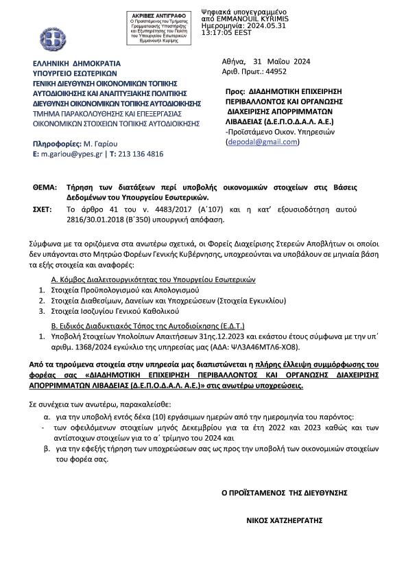 • Μη συμμόρφωση σε υποχρεώσεις οι οποίες άπτονται οικονομικών ζητημάτων της Διαδημοτικής Επιχείρησης ΔΕΠΟΔΑΛ που ως δήμαρχος Λεβαδέων ήσασταν Πρόεδρος και ο Δήμος κύριος μέτοχος και τώρα εμείς ως νέα Δημοτική Αρχή καλούμαστε να διεκπεραιώσουμε.