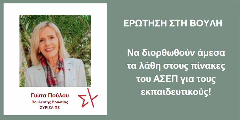 Με ερώτηση που καταθέσαμε στη Βουλή και απευθύνεται στους Υπουργούς Εσωτερικών και Παιδείας, 15 βουλευτές του ΣΥΡΙΖΑ-ΠΣ επαναφέρουμε το μείζον ζήτημα που έχει προκύψει για ακόμα μια χρονιά, μετά από καταγγελίες εκατοντάδων εκπαιδευτικών, οι οποίοι με την ανακοίνωση των αποτελεσμάτων των Προσωρινών Πινάκων ΑΣΕΠ ανακάλυψαν ότι, εξαιτίας ασαφειών διατύπωσης και λαθών του πληροφοριακού συστήματος, δεν τους είχαν προσμετρηθεί όλα τα μόριά τους, όπως δικαιούνταν.