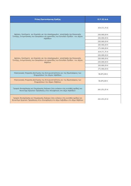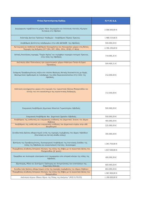 - Η διαμόρφωση του περιβάλλοντος χώρου του νέου Δημαρχείου και η ανάπλαση της πλατείας Λάμπρου Κατσώνη στη Λιβαδειά, προϋπολογισμού 2 εκατ. ευρώ.