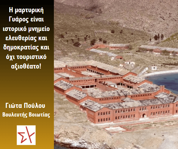 Όχι στην ιστορική λήθη που μεταμφιέζεται σε δήθεν ανάπλαση! Να γίνει επιτέλους η Γυάρος μνημείο δημοκρατίας και ελευθερίας, αλλά και καταφύγιο της φυσικής βιοποικιλότητας του Αιγαίου! Να τιμήσουμε στην πράξη, όχι στα λόγια, τους αγωνιστές εξόριστους και φυλακισμένους!