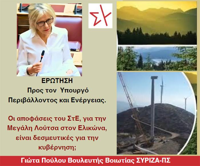 Συγκεκριμένα, ενώ έχουν ήδη εκδοθεί, κατόπιν προσφυγών του Συλλόγου Ελικωνίων, του Δήμου Λεβαδέων και κατοίκων της ευρύτερης περιοχής, δύο αποφάσεις του Συμβουλίου της Επικρατείας, οι οποίες ακύρωσαν τις Αποφάσεις Έγκρισης Περιβαλλοντικών Όρων (ΑΕΠΟ) για τον αιολικό σταθμό παραγωγής ηλεκτρικής ενέργειας στη θέση «Μεγάλη Λούτσα» του Ελικώνα, οι «επενδυτές» επανέρχονται με τρίτη μελέτη, ελάχιστα διαφοροποιημένη από τις προηγούμενες και «αντιγράφοντας» στοιχεία από το Χωροταξικό Πλαίσιο της Περιφέρειας Κρήτης!.