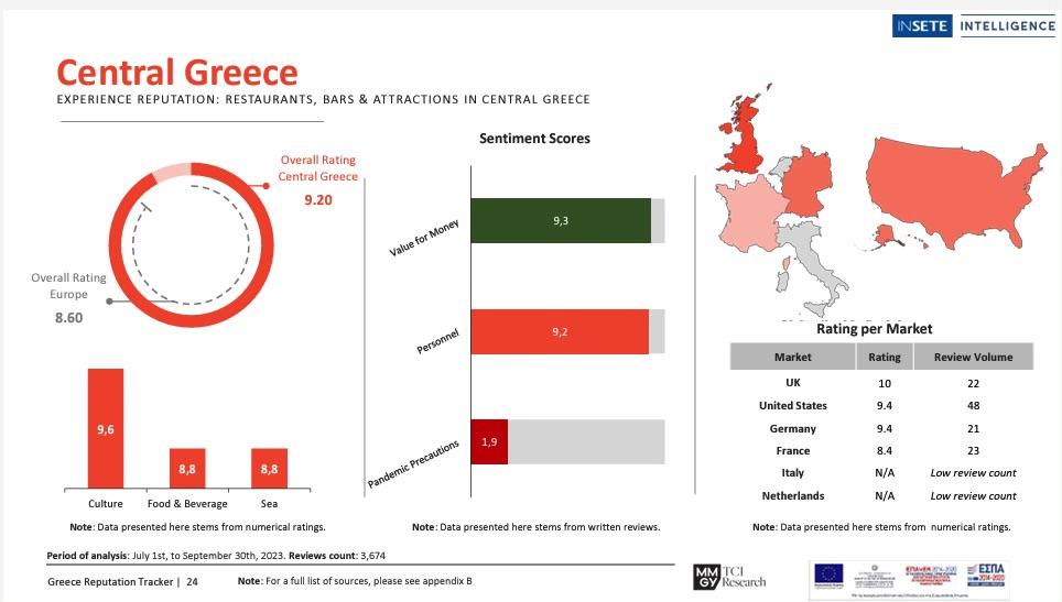 Σύμφωνα με έρευνα από το INSETE Intelligence με τίτλο: «Η φήμη της Ελλάδας και της κάθε Περιφέρειας στα κοινωνικά δίκτυα και τις ιστοσελίδες ταξιδιών – Q2 2024», που διεξήχθη στο πλαίσιο παρακολούθησης της τουριστικής δραστηριότητας μέσα από διαφοροποιημένες πηγές, και σε συνεργασία με την εταιρεία TCI Research (που πλέον αποτελεί τμήμα της εταιρείας MMGY) σχετικά με τη συλλογή big data για την Ελλάδα και ανταγωνιστικούς προορισμούς (Ιταλία, Ισπανία, Πορτογαλία, Κροατία) που επιτρέπει τη σύγκριση της συνολικής εικόνας της χώρας και της Αθήνας με τον ανταγωνισμό η Ελλάδα συνολικά, η κάθε Περιφέρεια ξεχωριστά αλλά και η Περιφέρεια Στερεάς Ελλάδας, διατήρησαν την ανταγωνιστικότητά τους, ως προς την εμπειρία επίσκεψης, με βαθμολογία υψηλότερη από τον ευρωπαϊκό μέσο όρο, επιβεβαιώνοντας τις δυνατότητες που υπάρχουν για τη χρονική και χωρική επέκταση της τουριστικής δραστηριότητας.