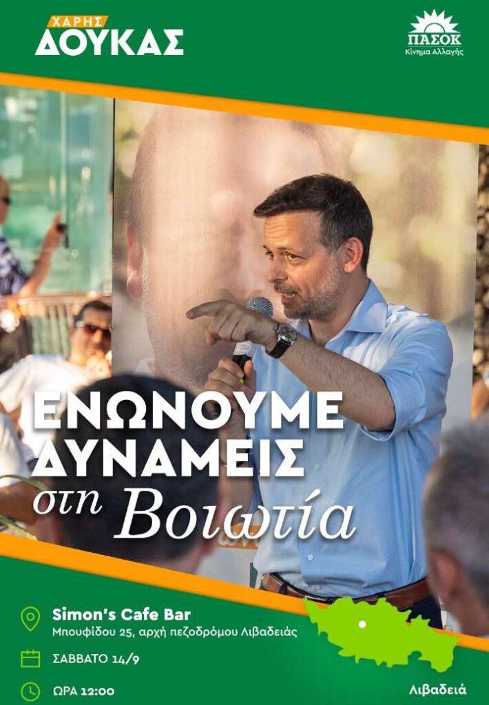 Ο υποψήφιος Πρόεδρος του ΠΑΣΟΚ, Χάρης Δούκας, στο πλαίσιο της προεκλογικής περιοδείας του, θα επισκεφθεί τη Βοιωτία, το Σαββατοκύριακο 14 και 15 Σεπτεμβρίου.