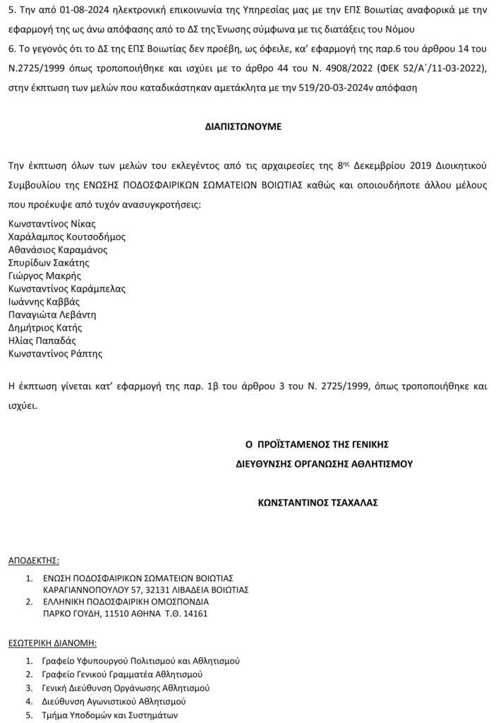 Η ΓΓΑ κήρυξε έκπτωτη όλη την Εκτελεστική Επιτροπή της ΕΠΣ Βοιωτίας που εξελέγη το 2021 επειδή δεν εφάρμοσε το άρθρο του νόμου και δεν αποφάσισε την έκπτωση του προέδρου κ Νίκα ο οποίος εμπίπτει στα κωλύματα του νόμου.