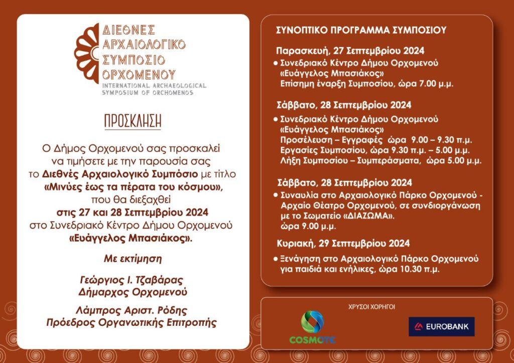 Ύστερα από τη μεσολάβηση σαράντα ετών από το 1ο Διεθνές Αρχαιολογικό Συνέδριο, που διοργανώθηκε στις 15 – 16 Σεπτεμβρίου 1984 στον Ορχομενό, ο Δήμος Ορχομενού και η ΕΦ.Α. Βοιωτίας συνδιοργανώνουν το Διεθνές Αρχαιολογικό Συμπόσιο Ορχομενού.