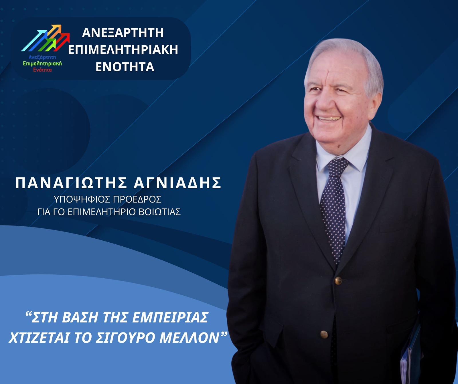 Την προσεχή Παρασκευή, 15 Νοεμβρίου και το Σάββατο, 16 Νοεμβρίου , αρχικά στη Λιβαδειά και την επόμενη ημέρα στη Θήβα, τα μέλη του Επιμελητηρίου Βοιωτίας καλούνται να επιλέξουν την νέα ηγεσία του. Ο κ. Παναγιώτης Αγνιάδης είναι ο επικεφαλής του Συνδυασμού «Ανεξάρτητη Επιμελητηριακή Ενότητα» και μαζί με ένα ανανεωμένο ψηφοδέλτιο, προσώπων που έχουν ταυτιστεί με την αναπτυξιακή προοπτική της τοπικής μας κοινωνίας, διεκδικούν να γίνουν η επιλογή για την πλειοψηφία των ψηφοφόρων. Με «όπλο» του το έργο, την εμπειρία του, το πολύπλευρο μωσαϊκό των προσώπων με τους οποίους έχει διανύσει μια πλούσια διαδρομή διεκδικήσεων για την επιχειρηματική κοινότητα, ο κ. Αγνιάδης απαντάει σε μια εφ` όλης της ύλης συνέντευξη.