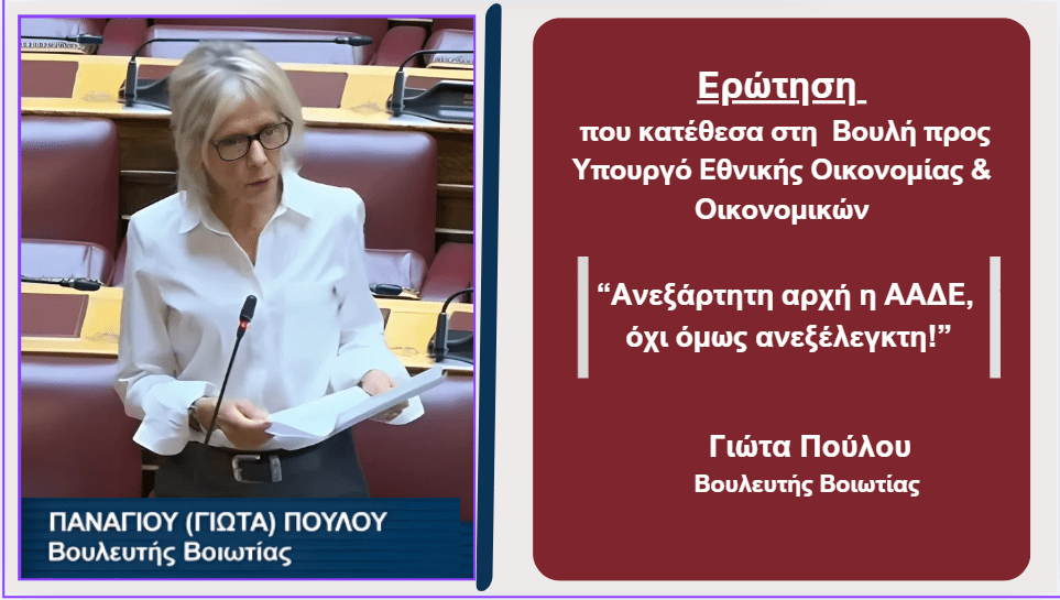 Με Ερώτηση και Αίτηση Κατάθεσης Εγγράφων που κατέθεσα σήμερα στη Βουλή και απευθύνεται στον Υπουργό Οικονομικών αναδεικνύω τα σοβαρά ερωτήματα που εγείρονται σχετικά με τη διαφάνεια και την αξιοπιστία στις διαγωνιστικές διαδικασίες της ΑΑΔΕ. Ερωτήματα που προκύπτουν κατόπιν των καταγγελιών στον έντυπο και ηλεκτρονικό τύπο για μεθοδεύσεις κατά την διεξαγωγή διαγωνιστικής διαδικασίας στέγασης των υπηρεσιών της ΑΑΔΕ, προκειμένου να προκριθεί η μίσθωση ακινήτου που ανήκει σε συγκεκριμένα επιχειρηματικά συμφέροντα, με διασυνδέσεις στο άμεσο πρωθυπουργικό περιβάλλον.