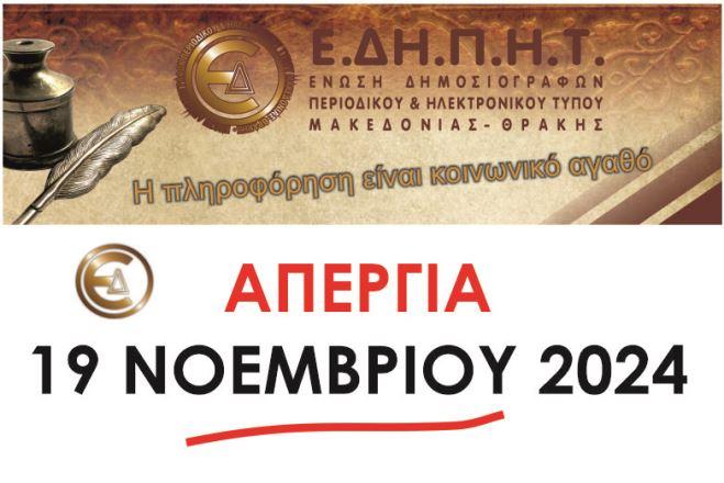 Η Ένωση Δημοσιογράφων Περιοδικού και Ηλεκτρονικού Τύπου Μακεδονίας Θράκης (Ε.ΔΗ.Π.Η.Τ.), συμμετέχει μαζί με όλους τους εργαζόμενους της χώρας στην 24ωρη Πανελλαδική απεργία που έχει κηρύξει η ΓΣΕΕ.