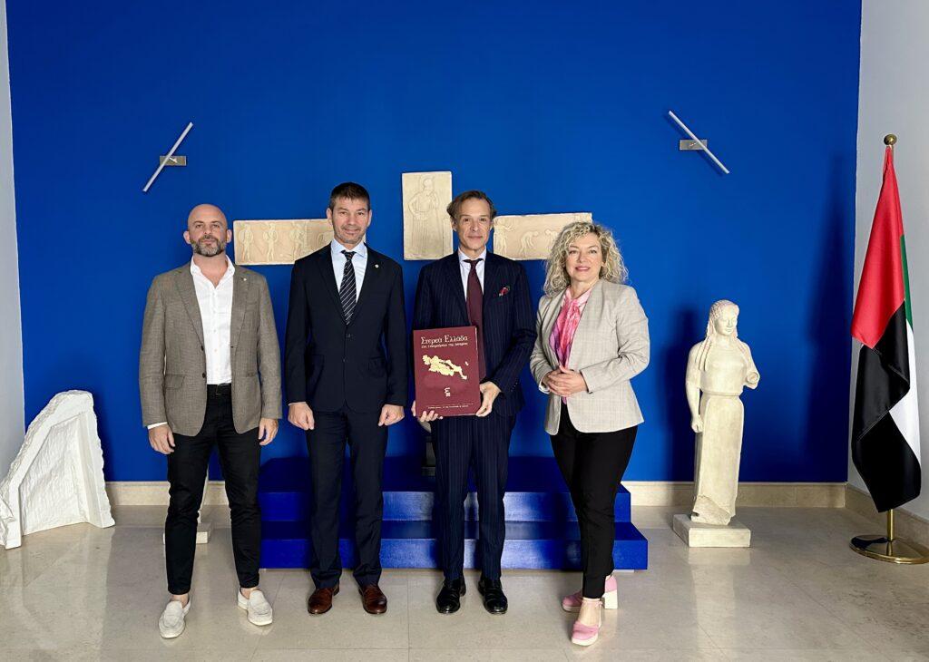 Στο πλαίσιο των διερευνητικών συναντήσεων της Περιφέρειας για επέκταση και εδραίωση των προϊόντων της Στερεάς Ελλάδας στα Ηνωμένα Αραβικά Εμιράτα, οι εκπρόσωποί της επισκέφθηκαν την Ελληνική Πρεσβεία στο Αμπού Ντάμπι, πρωτεύουσα των ΗΑΕ, όπου είχαν μακρά και εποικοδομητική συνάντηση με τον Πρέσβη κ. Αντώνη Αλεξανδρίδη και τον Γενικό Πρόξενο κ. Παναγιώτη Κουγιού. Οι εκπρόσωποι της Πρεσβείας επεσήμαναν την ευνοϊκή προοπτική τοποθέτησης των προϊόντων της Στερεάς Ελλάδας στη λεγόμενη “niche market” (περιορισμένο και εξειδικευμένο κομμάτι της αγοράς) των ΗΑΕ και την ιδιαίτερα θετική προοπτική κλάδων, όπως το εμφιαλωμένο νερό, τα αναψυκτικά κλπ.