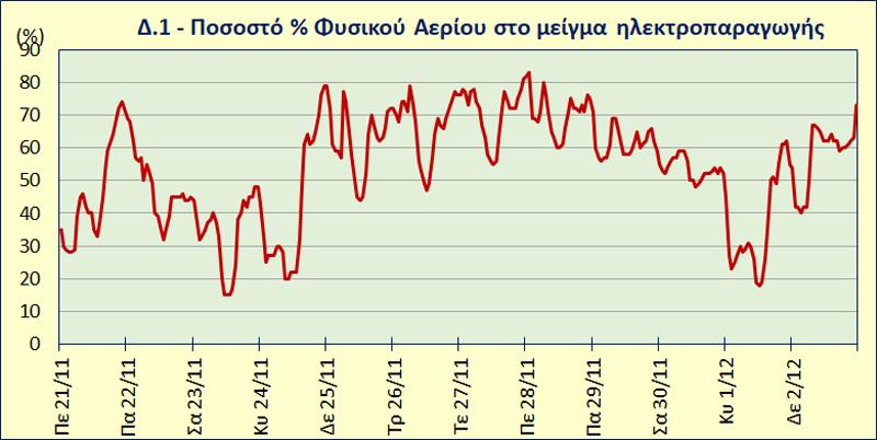 Στο 1ο διάγραμμα (Δ.1) βλέπουμε πως από την Πέμπτη 21 Νοεμβρίου έως και τη Δευτέρα 2 Δεκεμβρίου 2024 το φυσικό αέριο συμμετείχε σε ποσοστό πάνω από 54% στο μείγμα ηλεκτροπαραγωγής (στοιχεία από Ipto Analytics του ΑΔΜΗΕ). Μέχρι και στο 83% έφθασε, (στις 2 τη νύχτα της 28/11). Το φυσικό αέριο είναι 100% εισαγόμενο καύσιμο, με την τιμή να φουσκώνει στα διεθνή χρηματιστήρια και να φουσκώνει αντίστοιχα την τιμή του ηλεκτρισμού. Το ποσοστό του φυσικού αερίου μειώνεται μόνο όταν μειώνεται η ζήτηση του ρεύματος.