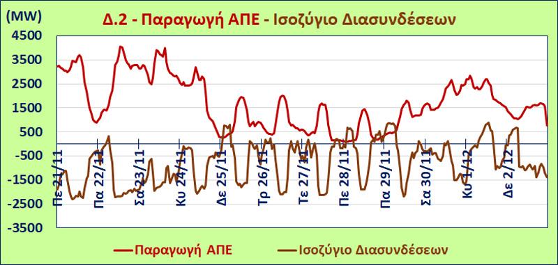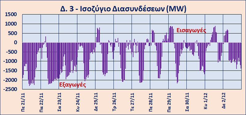 Στο 3ο διάγραμμα, (Δ.3), από το «ισοζύγιο διασυνδέσεων» βλέπουμε πως η Ελλάδα ήταν έντονα εξαγωγική χώρα. Αυτό μπορεί να ωφέλησε τους εξαγωγείς ηλεκτρισμού, αλλά καθόλου δεν ωφέλησε τους καταναλωτές και την οικονομία της χώρας. Κι ούτε πρόκειται φυσικά να μας ωφελήσει στο μέλλον.