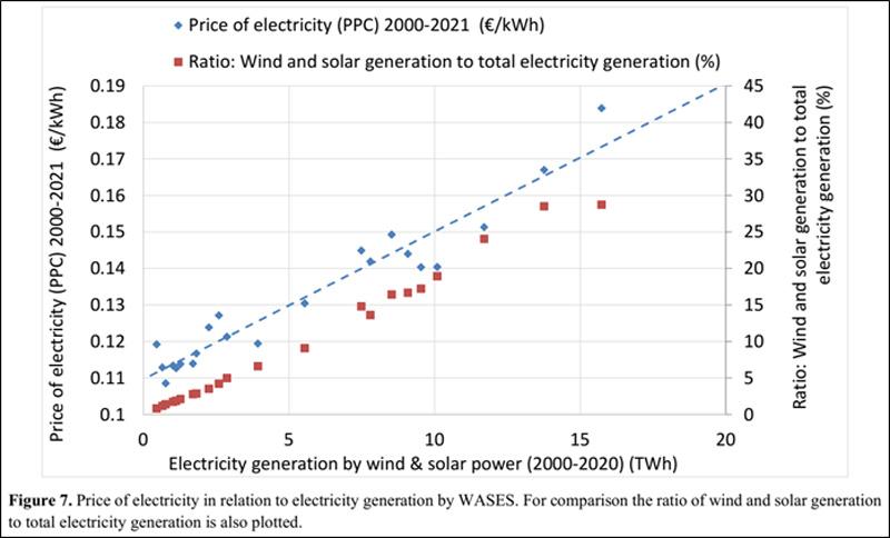 Η πιο κάτω εικόνα 7 (Figure 7) της εργασίας είναι απολύτως αποκαλυπτική για το τι πραγματικά έχουν προκαλέσει στην τιμή του ρεύματος οι αθρόες εγκαταστάσεις αιολικών και φωτοβολταϊκών: στην περίοδο 2000-2020 η αύξηση στην τιμή του ρεύματος (γαλάζια σημεία) αυξάνεται εντελώς παράλληλα με την παραγωγή των δήθεν «Α»ΠΕ (κόκκινα σημεία). Για τον πολύ απλό λόγο πως τα αιολικά & φωτοβολταϊκά τεχνικά ΔΕΝ μπορούν ποτέ να υποκαταστήσουν ΑΞΙΌΠΙΣΤΑ τις θερμικές μονάδες κι ο ΕΓΧΩΡΙΟΣ λιγνίτης υποκαταστάθηκε από ΕΙΣΑΓΟΜΕΝΟ φυσικό αέριο.