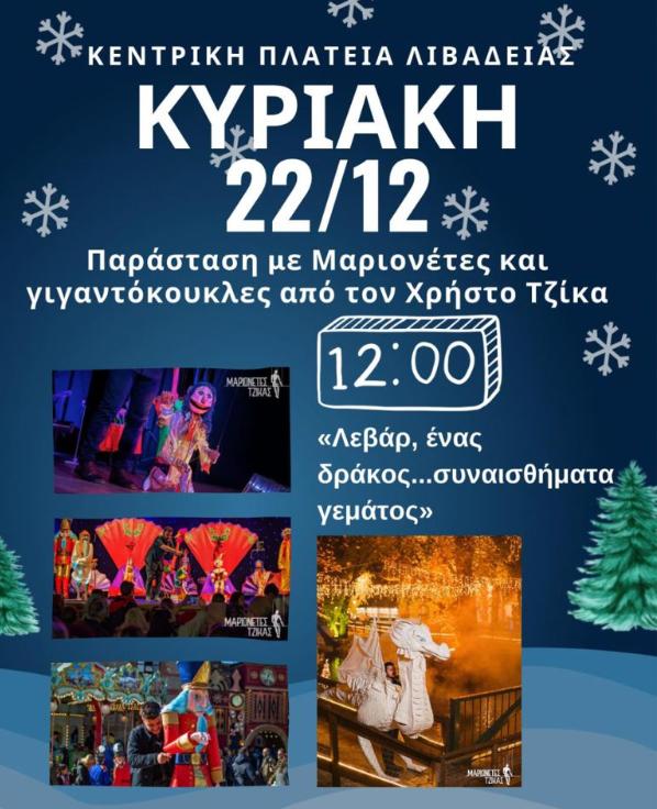 Λόγω αυξημένης πιθανότητας βροχόπτωσης (σύμφωνα με τα δελτία καιρού), η παράσταση «Λεβάρ, ένας δράκος… συναισθήματα γεμάτος», με τις μαριονέτες και τις γιγαντοκούκλες και ο Χρήστος Τζίκας αντί για Σάββατο 21/12 θα είναι μαζί μας την Κυριακή 22/12 στις 12:00 στην Κεντρική Πλατεία της Λιβαδειάς.