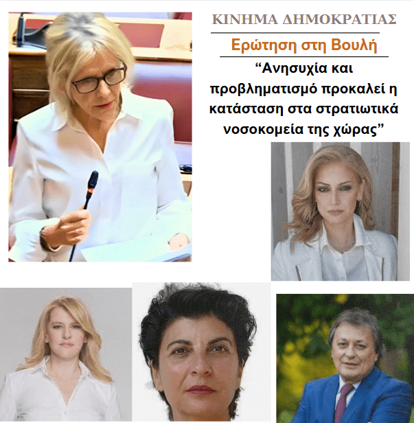 Πέντε Ανεξάρτητοι Βουλευτές-μέλη του Κινήματος Δημοκρατίας συνυπογράφουμε Ερώτηση προς τον Υπουργό Εθνικής Άμυνας, με την οποία ζητάμε απαντήσεις, αφενός, για την εντολή που προς τον Αρχηγό ΓΕΕΘΑ στις 10/12/2024 για τη διεξαγωγή έκτακτων κρίσεων με σκοπό την αναδιοργάνωση των Στρατιωτικών Νοσοκομείων και, αφετέρου, για τις πληροφορίες ότι επίκειται κατάθεση νομοσχεδίου που προβλέπει μέτρα υποβάθμισης των υπηρεσιών υγείας προς τους στρατιωτικούς. Δεν είναι σύμπτωση, άλλωστε, ότι σημειώνονται πολλές παραιτήσεις ιατρών και υγειονομικού προσωπικού από τα στρατιωτικά νοσοκομεία της χώρας.