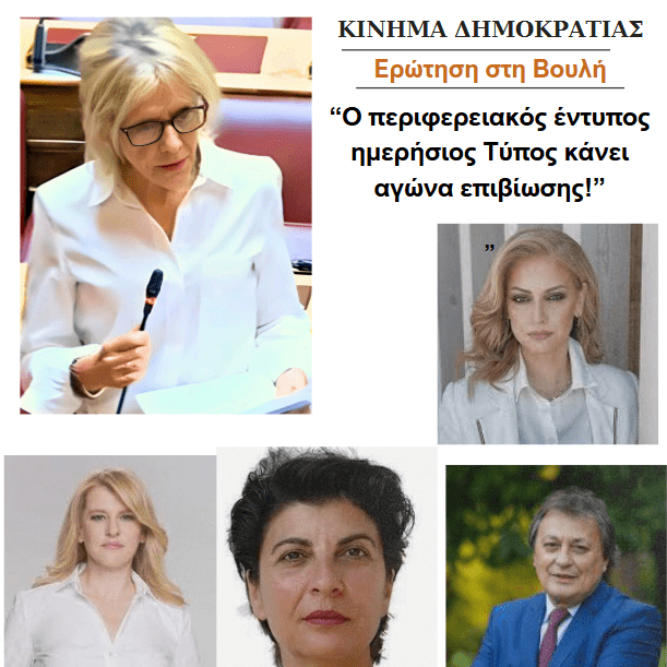 Με Ερώτηση που κατέθεσα στη Βουλή, την οποία συνυπογράφουν οι πέντε Ανεξάρτητοι Βουλευτές μέλη του Κινήματος Δημοκρατίας και απευθύνεται στον πρωθυπουργό, αναδεικνύουμε την απραξία της Κυβέρνησης μπροστά στα σοβαρά και επείγοντα προβλήματα που αντιμετωπίζει ο ημερήσιος έντυπος Τύπος της ελληνικής περιφέρειας, τα οποία θέτουν σε κίνδυνο την ίδια τη λειτουργία πολλών εφημερίδων.