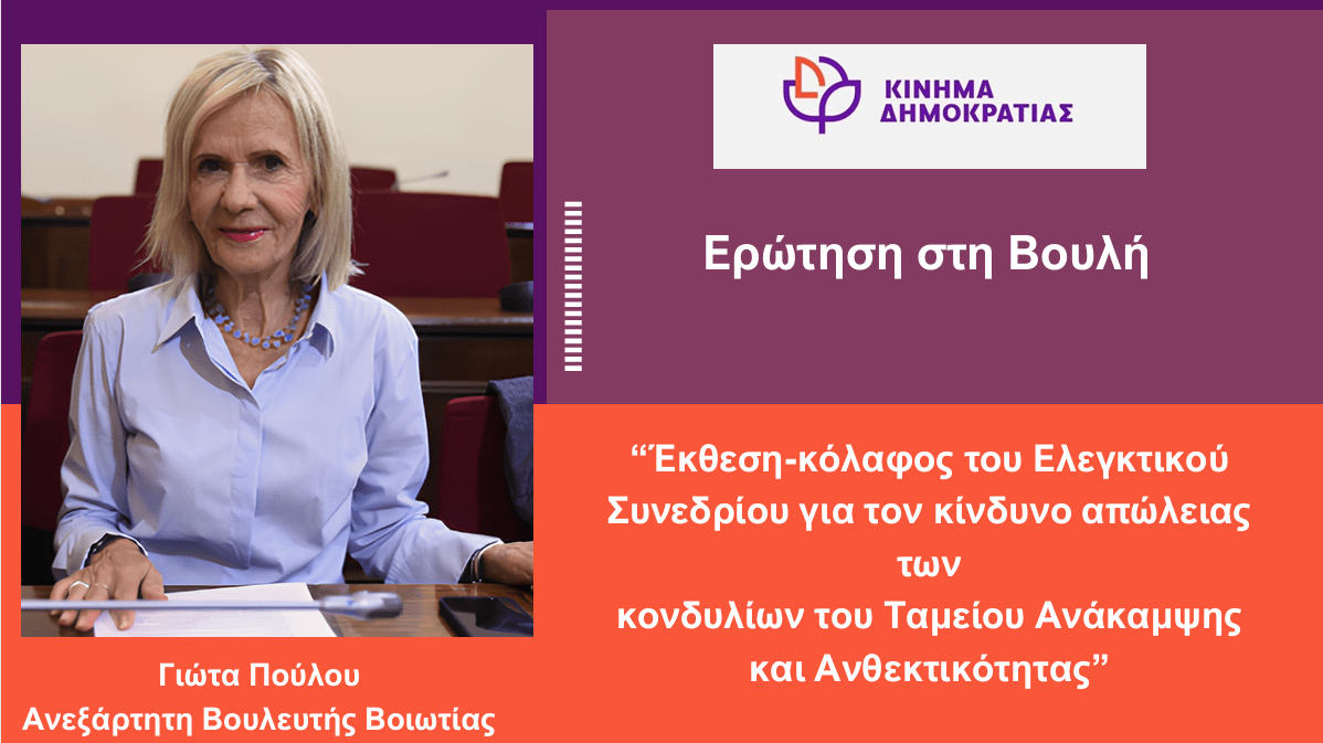 Με Ερώτηση και Αίτηση Κατάθεσης Εγγράφων που κατέθεσα σήμερα στη Βουλή, την οποία συνυπογράφουμε οι πέντε Ανεξάρτητοι Βουλευτές. μέλη του Κινήματος Δημοκρατίας, αναδεικνύουμε τους σοβαρούς κινδύνους για την απώλεια κονδυλίων των Ευρωπαϊκού Ταμείου Ανάκαμψης και Ανθεκτικότητας, λόγω σοβαρών ελλείψεων και καθυστερήσεων στην υλοποίηση και την παρακολούθηση των έργων που έχουν ήδη ενταχθεί και δεν επιδέχονται αμφισβήτησης.