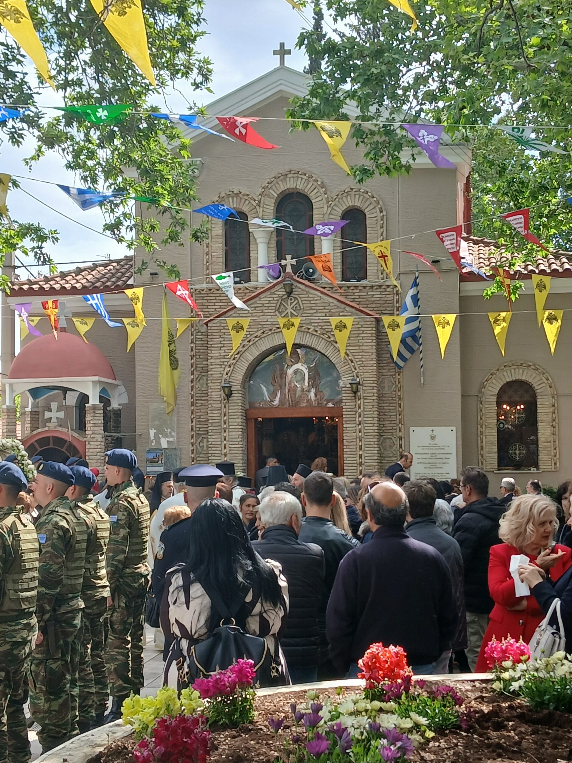 Μετά τον Όρθρο και τη Θεία Λειτουργία – ιερουργούντος του Σεβασμιώτατου Ποιμενάρχου μας Γεωργίου και των προσκεκλημένων Σεβασμιώτατων Αρχιερέων Παροναξίας Καλλινίκου και Επισκόπου Θεσπιέων Παύλου, έγινε η Λιτάνευση της ιεράς Εικόνας του Αγίου και του Τιμίου Ξύλου της Ιεράς Μονής Σαγματά συνοδεία αγήματος του Στρατού υπό τους εμβατηριακούς ήχους της Φιλαρμονικής του Δήμου Θηβαίων.
