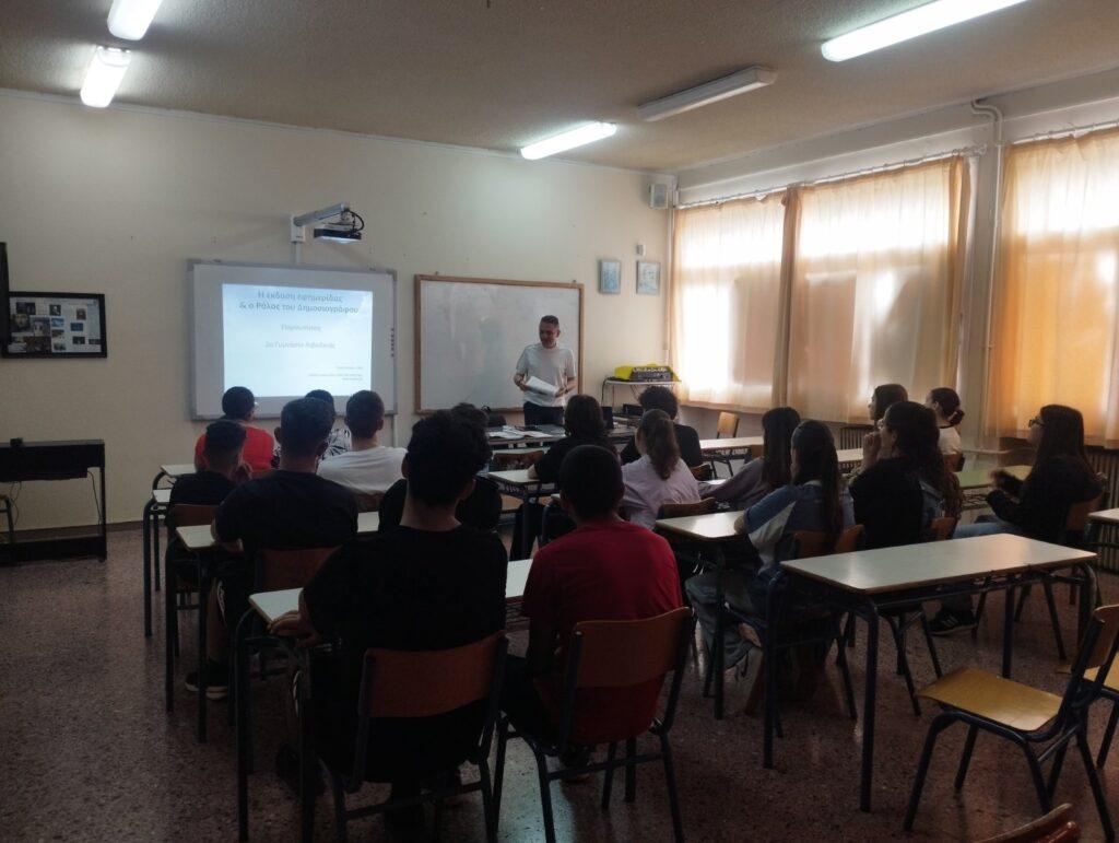 Στο πλαίσιο του Πολιτιστικού Προγράμματος με τίτλο «Το Περιοδικό μας», η συντακτική ομάδα του σχολικού περιοδικού αποτελούμενη από μαθητές της Γ’ Τάξης καθώς και οι υπεύθυνες καθηγήτριες υποδέχθηκαν με χαρά και παρακολούθησαν με αμείωτο ενδιαφέρον την εισήγηση του κ. Καντά Ιωάννη, δημοσιογράφου και εκδότη της εφημερίδας «ΝΕΑ ΤΗΣ ΒΟΙΩΤΙΑΣ» και περί δημοσιογραφίας αλλά και έκδοσης μιας εφημερίδας, έντυπης και ηλεκτρονικής.