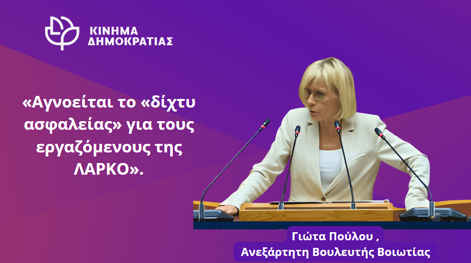 Η Βουλευτής Παναγιού (Γιώτα) Πούλου καταθέτει ως Αναφορά, κατ’ άρθρο 125 ΚτΒ, προς τον κ. Υπουργό Εθνικής Οικονομίας & Οικονομικών και την κ. Υπουργό Εργασίας την από 25//06/2025 Ανακοίνωση του Σωματείου Εργαζομένων ΛΑΡΚΟ, η οποία αναφέρεται στις συνθήκες των απολυμένων εργαζομένων της ΛΑΡΚΟ, 11 μήνες μετά τις ομαδικές απολύσεις, και στην αποτυχία της κυβέρνησης να υλοποιήσει το εξαγγελθέν «κοινωνικό δίχτυπροστασίας».