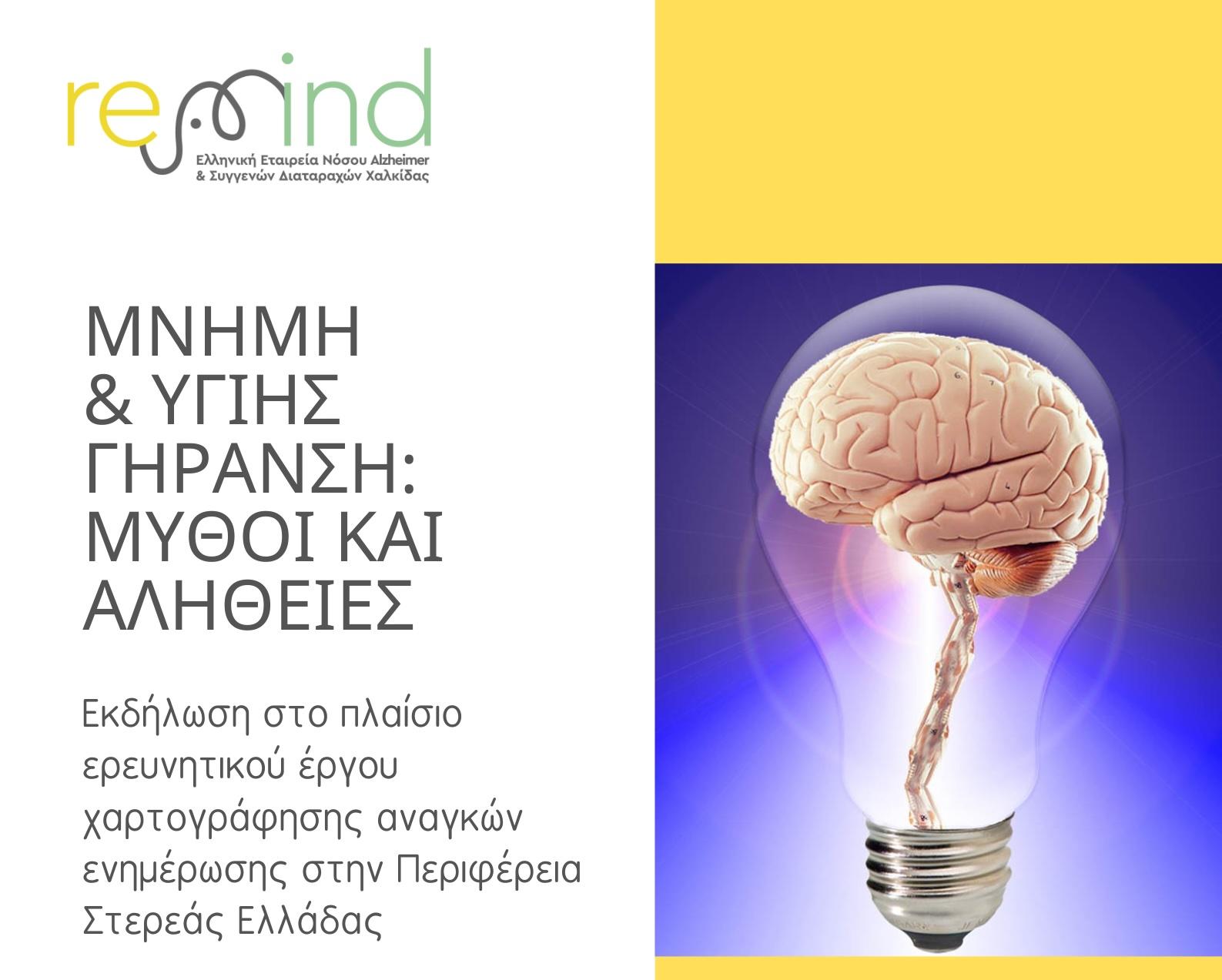 Η Περιφέρειας Στερεάς Ελλάδας με τη συνεργασία του «REMIND-Alzheimer Χαλκίδας» εκκινούν την διεξαγωγή σειράς ενημερωτικών εκδηλώσεων με τίτλο: «Μνήμη και Υγιής Γήρανση-Μύθοι και Αλήθειες», στο πλαίσιο υλοποίησης του έργου: «Διερεύνηση και Χαρτογράφηση των Αναγκών της Τρίτης Ηλικίας στον Τομέα των Προβλημάτων Μνήμης», για την Πράξη «Περιφερειακό Παρατηρητήριο Κοινωνικής Ένταξης Περιφέρειας Στερεάς Ελλάδας – Δομή ΓΕΦΥΡΑ».