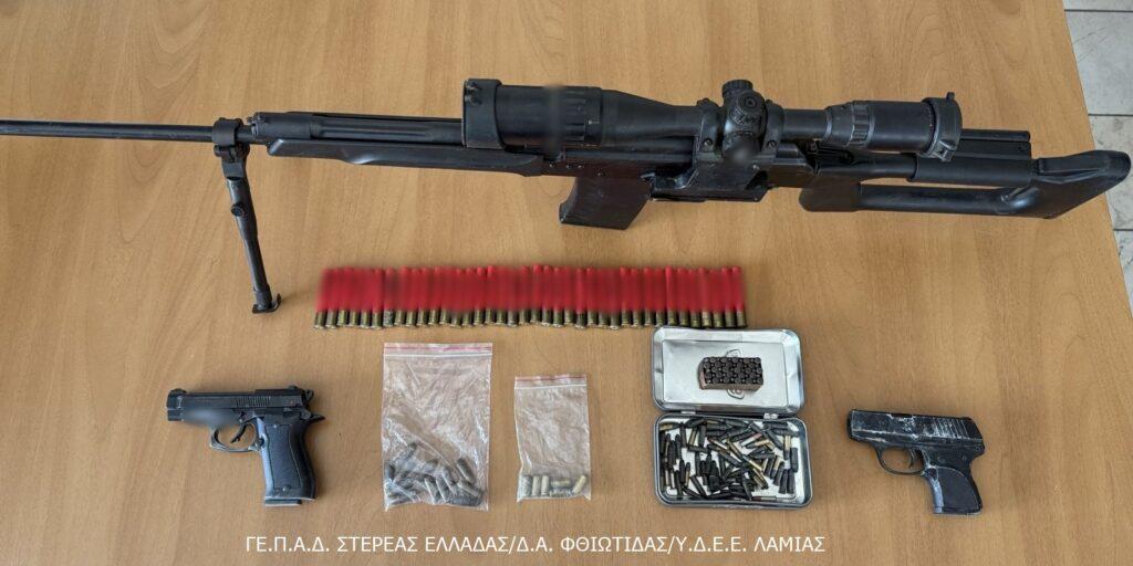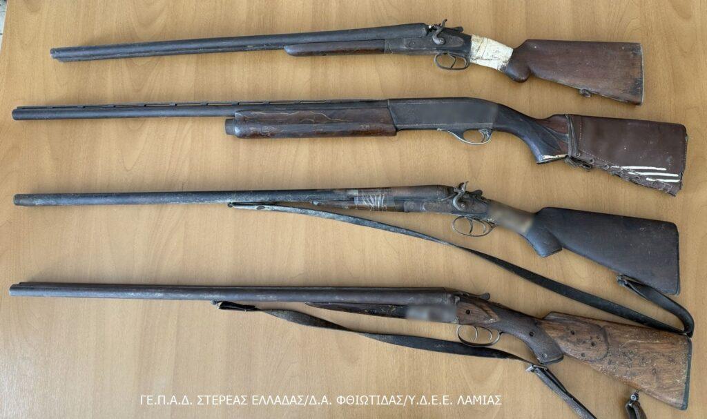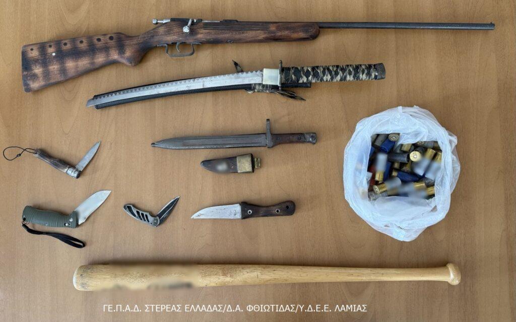 - 6 κυνηγετικά όπλα, 1 περίστροφο, πιστόλι replica, μαχαίρια, ξιφολόγχες, σπαθί