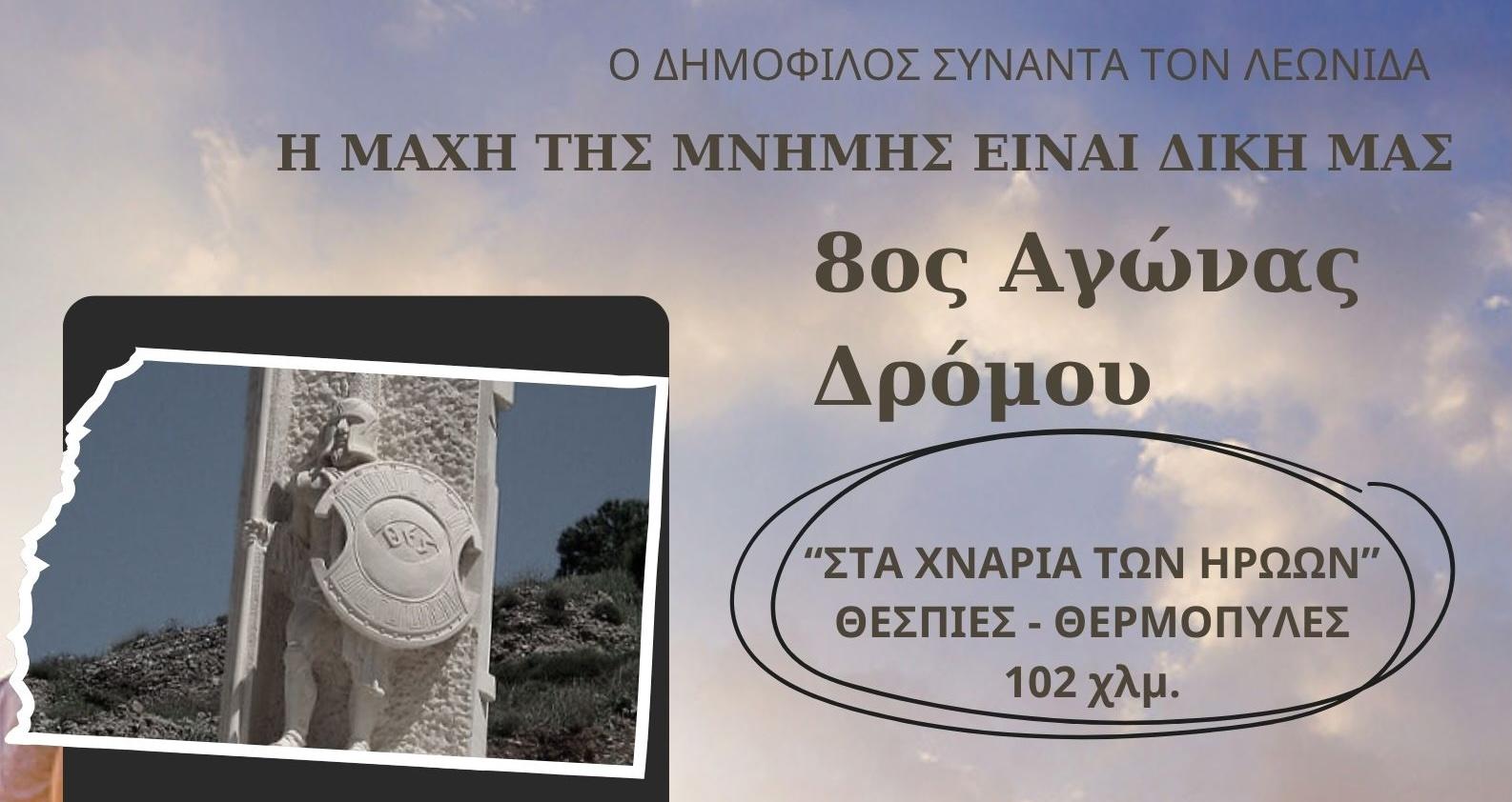 Ο Δήμος Αλιάρτου – Θεσπιέων και η Δημοτική Κοινότητα Θεσπιών αναβιώνουν για όγδοη συνεχόμενη χρονιά έναν αγώνα μοναδικής ιστορικής και συμβολικής σημασίας: τον Αγώνα Δρόμου “Στα Χνάρια των Ηρώων”, μια υπεραπόσταση 102 χιλιομέτρων από τις Θεσπιές έως τις Θερμοπύλες, στη μνήμη της ανιδιοτελούς θυσίας των 700 Θεσπιέων που έπεσαν μαχόμενοι στο πλευρό του Λεωνίδα το 480 π.Χ.
