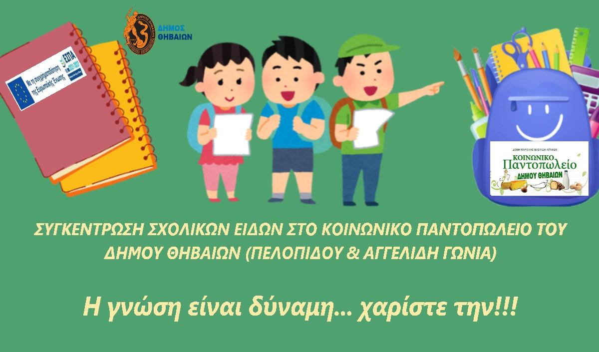 Λίγο πριν το πρώτο κουδούνι και την επίσημη έναρξη της σχολικής χρονιάς, το Κοινωνικό Παντοπωλείο του Δήμου Θηβαίων με αίσθημα ευθύνης και αλληλεγγύης προς τις ευάλωτες κοινωνικά ομάδες συγκεντρώνει σχολικά είδη, απαραίτητα για την εύρυθμη μελέτη και σπουδή των μαθητών.