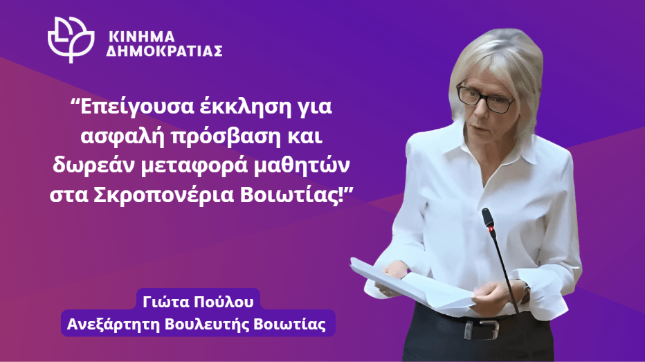 Με δύο επίκαιρες Ερωτήσεις προς τους Υπουργούς Παιδείας, Εσωτερικών και Υποδομών, η Βουλευτής Βοιωτίας Γιώτα Πούλου –με τη συνυπογραφή των Ανεξάρτητων Βουλευτών του Κινήματος Δημοκρατίας– κρούει τον κώδωνα του κινδύνου για την τραγική κατάσταση που επικρατεί στη μεταφορά των μαθητών στην περιοχή των Σκροπονέρων.