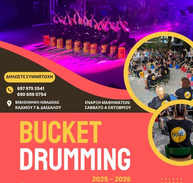 Το Bucket Drumming είναι ένα διαδραστικό μουσικό εργαστήριο, όπου οι συμμετέχοντες χρησιμοποιούν πλαστικούς κουβάδες και μπαγκέτες για να δημιουργήσουν ρυθμούς, μουσικά σχήματα και ομαδικές συνθέσεις.