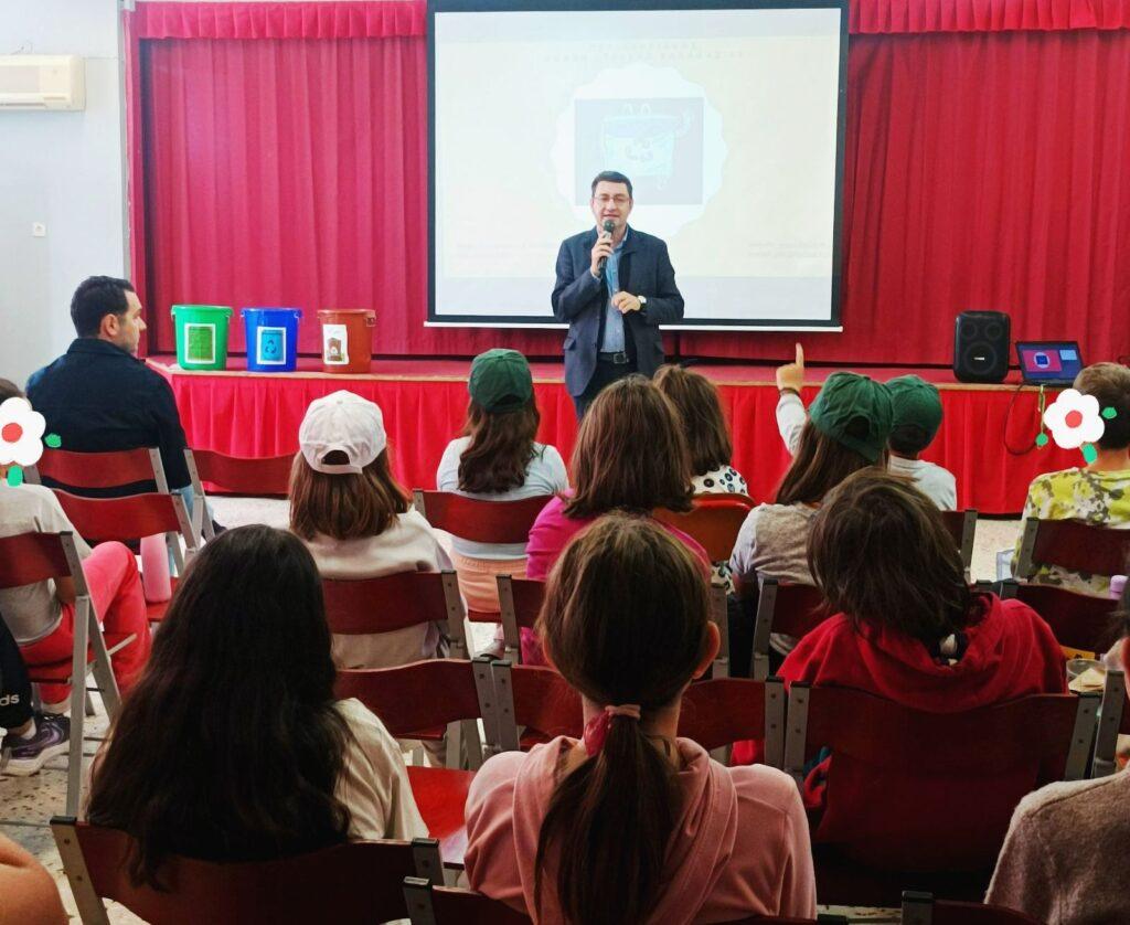 Μαζί του, η Αντιδήμαρχος Παιδείας κ. Γιούλη Καζάνα και ο Δημοτικός Σύμβουλος κ. Αθανάσιος Αγγελής, ενθάρρυναν τους μαθητές να «διδάξουν» στα σπίτια τους το σωστό τρόπο ανακύκλωσης και να μοιράσουν το οικολογικό τους μήνυμα στους μεγάλους.