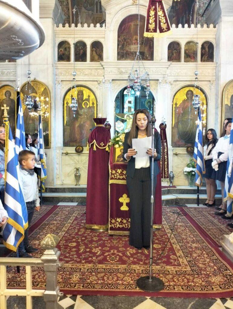 Αμέσως μετά, τον Πανηγυρικό της Ημέρας εκφώνησε με συγκίνηση η εκπαιδευτικός κα Άννα Γεωργιάδου, η οποία ανέδειξε το μεγαλείο του ιστορικού «ΟΧΙ», καθώς και τη διαχρονική αξία της ελευθερίας και της εθνικής αξιοπρέπειας. Με λόγια απλά και ουσιαστικά, κάλεσε όλους να αντλούν δύναμη από το παράδειγμα των προγόνων, προκειμένου να σταθούν με πίστη και ενότητα απέναντι στις προκλήσεις του σήμερα.