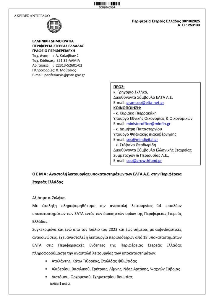 Η Περιφέρεια Στερεάς Ελλάδας στέλνει σαφές μήνυμα προς τη Διοίκηση των ΕΛΤΑ και την Πολιτεία: