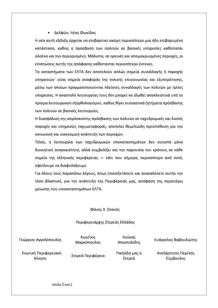 Η απόφαση για την αναστολή λειτουργίας υποκαταστημάτων των ΕΛΤΑ σε καίριες περιοχές της Στερεάς Ελλάδας, όπως η Αταλάντη, η Κάτω Τιθορέα, η Στυλίδα, αλλά και το Αλιβέρι, το Βασιλικό, η Ερέτρια, η Λίμνη, η Νέα Αρτάκη και τα Ψαχνά στην Εύβοια, καθώς και το Δίστομο, ο Ορχομενός, το Σχηματάρι στη Βοιωτία και οι Δελφοί και η Ιτέα στη Φωκίδα, προκάλεσε την έντονη αντίδραση του Περιφερειάρχη Στερεάς Ελλάδας, Φάνη Σπανού.