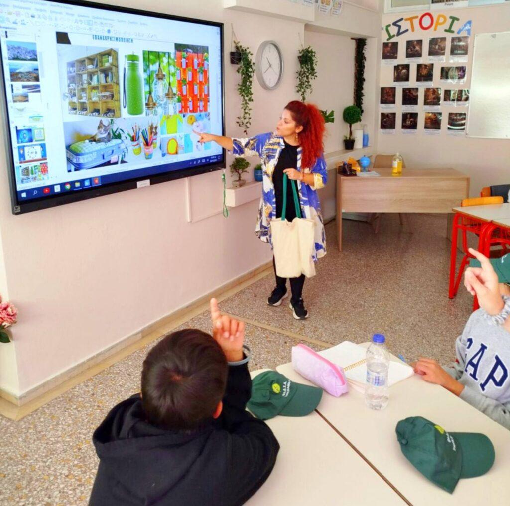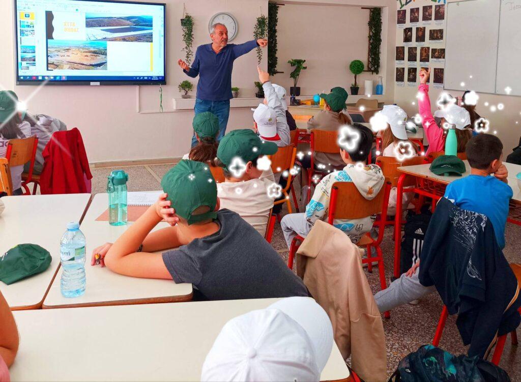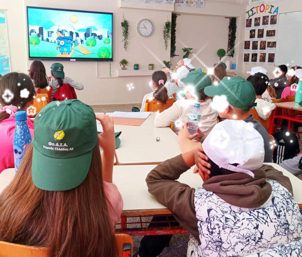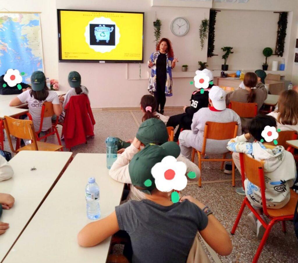 Μαθητές και εκπαιδευτικοί παρακολούθησαν με ενθουσιασμό μια διαδραστική παρουσίαση και εκπαιδευτικά κινούμενα σχέδια σχετικά με τη σωστή διαχείριση απορριμμάτων, την ανακύκλωση, την κομποστοποίηση και την επαναχρησιμοποίηση υλικών.