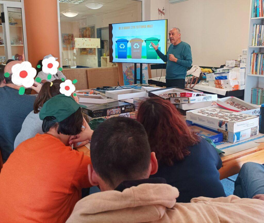 Οι συμμετέχοντες παρακολούθησαν παρουσίαση και ενημερωτικά βίντεο για την ανακύκλωση, επαναχρησιμοποίηση, κομποστοποίηση και τη σωστή διαχείριση αποβλήτων, καθώς και για έννοιες όπως ΧΑΔΑ, ΧΥΤΑ και ΜΕΑ, προσεγγισμένες με τρόπο κατανοητό και φιλικό για όλους.