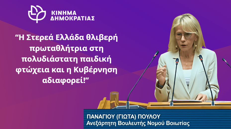 Η Στερεά Ελλάδα καταγράφει το υψηλότερο ποσοστό πολυδιάστατης παιδικής φτώχειας σε ολόκληρη τη χώρα, σύμφωνα με ερώτηση που κατέθεσε στη Βουλή η Ανεξάρτητη Βουλευτής Βοιωτίας και μέλος του Κινήματος Δημοκρατίας, Γιώτα Πούλου. Μαζί με άλλους Ανεξάρτητους Βουλευτές, η κα Πούλου ζητά από την Υπουργό Κοινωνικής Συνοχής και Οικογένειας εξηγήσεις για την καθυστέρηση εφαρμογής βασικών κοινωνικών προγραμμάτων.