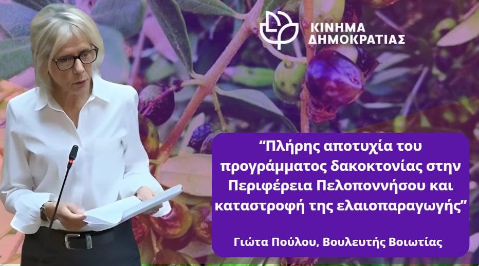 Κατέθεσα σήμερα στη Βουλή, με τη συνυπογραφή των Βουλευτών – μελών του Κινήματος Δημοκρατίας, Ερώτηση προς τον Υπουργό Αγροτικής Ανάπτυξης & Τροφίμων, με την οποία αναδεικνύουμε την πλήρη αποτυχία του προγράμματος δακοκτονίας στην Περιφέρεια Πελοποννήσου, που οδήγησε σε εκτεταμένη δακοπροσβολή, εξάπλωση γλοιοσπορίου και τεράστια μείωση της ελαιοπαραγωγής (άνω του 40% κατά μέσο όρο, έως και 100% σε ορισμένες περιοχές), με αντίστοιχη υποβάθμιση της ποιότητας του ελαιόλαδου.