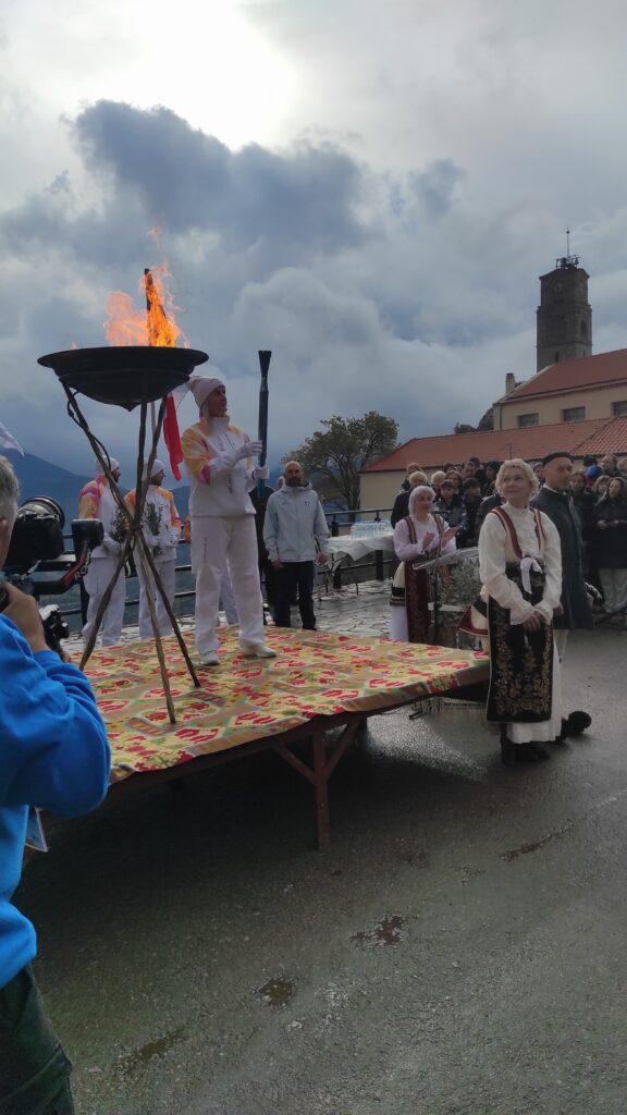 Στην Αράχωβα την υποδέχτηκαν μαθητές από Δημοτικά, Γυμνάσια και Νηπιαγωγεία της περιοχής, σχολές σκι, η τοπική Φιλαρμονική και πλήθος κατοίκων, δημιουργώντας μια μοναδική γιορτινή ατμόσφαιρα.