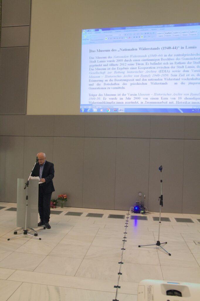 Στην εκδήλωση που ακολούθησε στην Ελληνική Πρεσβεία, ο κ. Φούντας παρουσίασε το σωματείο “Φίλοι Μουσείου Εθνικής Αντίστασης” του Δήμου Λαμιέων, την ιστορία ίδρυσής