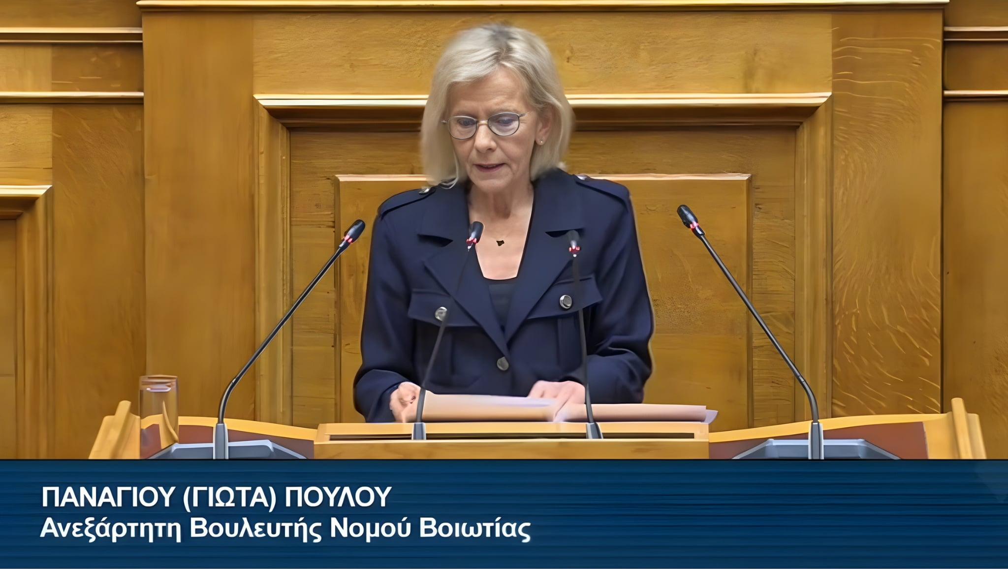 Σφοδρή κριτική στην κυβερνητική πολιτική για τον πρωτογενή τομέα άσκησε από το βήμα της Βουλής η Βουλευτής Βοιωτίας Γιώτα Πούλου, χαρακτηρίζοντας «προσχηματική» την πρόταση της Κυβέρνησης για σύσταση διακομματικής κοινοβουλευτικής επιτροπής. Στη δήλωσή της κάνει λόγο για «καταστροφικό αποτύπωμα» επτά ετών, αποδίδοντας στην κυβέρνηση ευθύνες για πλήγμα στους μικρομεσαίους παραγωγούς, για το σκάνδαλο του ΟΠΕΚΕΠΕ, για την αδυναμία αντιμετώπισης του κόστους παραγωγής και των κλιματικών καταστροφών, καθώς και για την κρίση στην κτηνοτροφία.