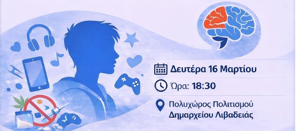 Η εκδήλωση θα πραγματοποιηθεί τη Δευτέρα 16 Μαρτίου 2026, στις 18:30, στον Πολυχώρο Πολιτισμού του Δημαρχείου Λιβαδειάς. Κεντρικός ομιλητής θα είναι ο Ορέστης Παπαγιαννόπουλος, ο οποίος θα αναφερθεί στους κινδύνους των εξαρτήσεων στην εφηβική ηλικία και στις στρατηγικές πρόληψης και υποστήριξης.