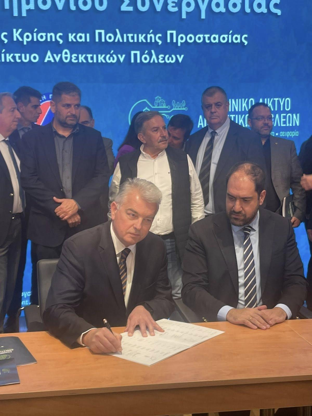 Στην τελετή υπογραφής του Μνημονίου Συνεργασίας, μεταξύ του Υπουργείου Κλιματικής Κρίσης και Πολιτικής Προστασίας και του Ελληνικού Δικτύου Ανθεκτικών Πόλεων, η οποία πραγματοποιήθηκε τη Δευτέρα, 30 Μαρτίου 2026, στην αίθουσα Άρης Γαρουφαλής του Ωδείου Αθηνών, παρευρέθηκε ο Δήμαρχος Δ. Δελφών κ. Παναγιώτης Ταγκαλής, συνοδευόμενος από τον Αντιδήμαρχο κ. Νικόλαο Λουπάκο.